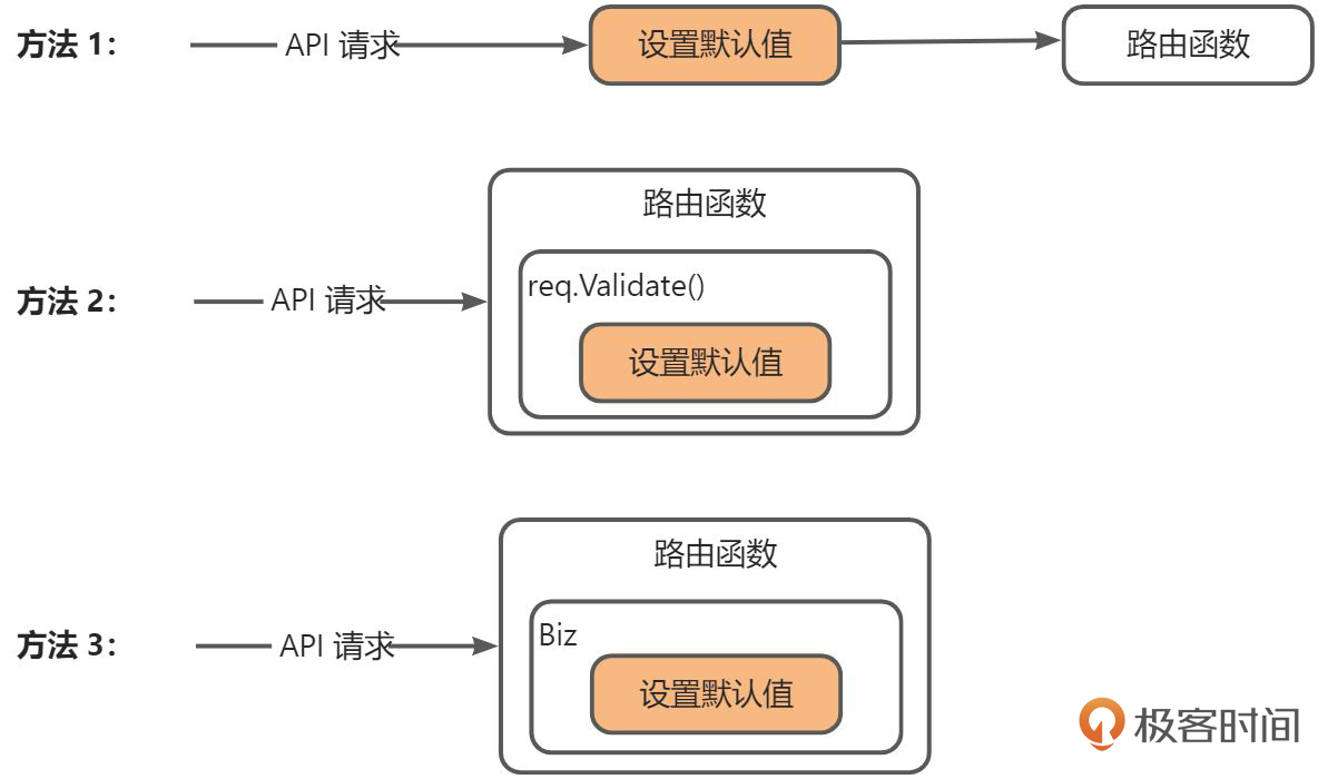 第 2 种方法是当一个 API 请求到来时,我们在进行参数校验的过程中,根据校验情况设置默认值,代码如下: