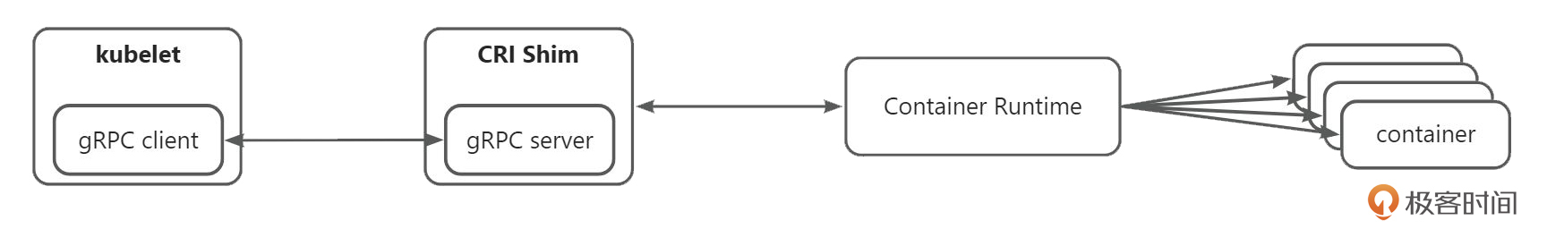 kubelet 只要做一个简要的 gRPC client 来支持 CRI 接口,在特定的容器进行时和 kubelet 之间有一个 shim 层(垫片),利用这个垫片来做适配。在 kubelet 需要支持一个新的运行时时,只需你在运行时那一方做垫片,而 kubelet 不需要做改动。比如,Docker、Containerd、CPI-O这些现在支持 CRI 的容器运行时。