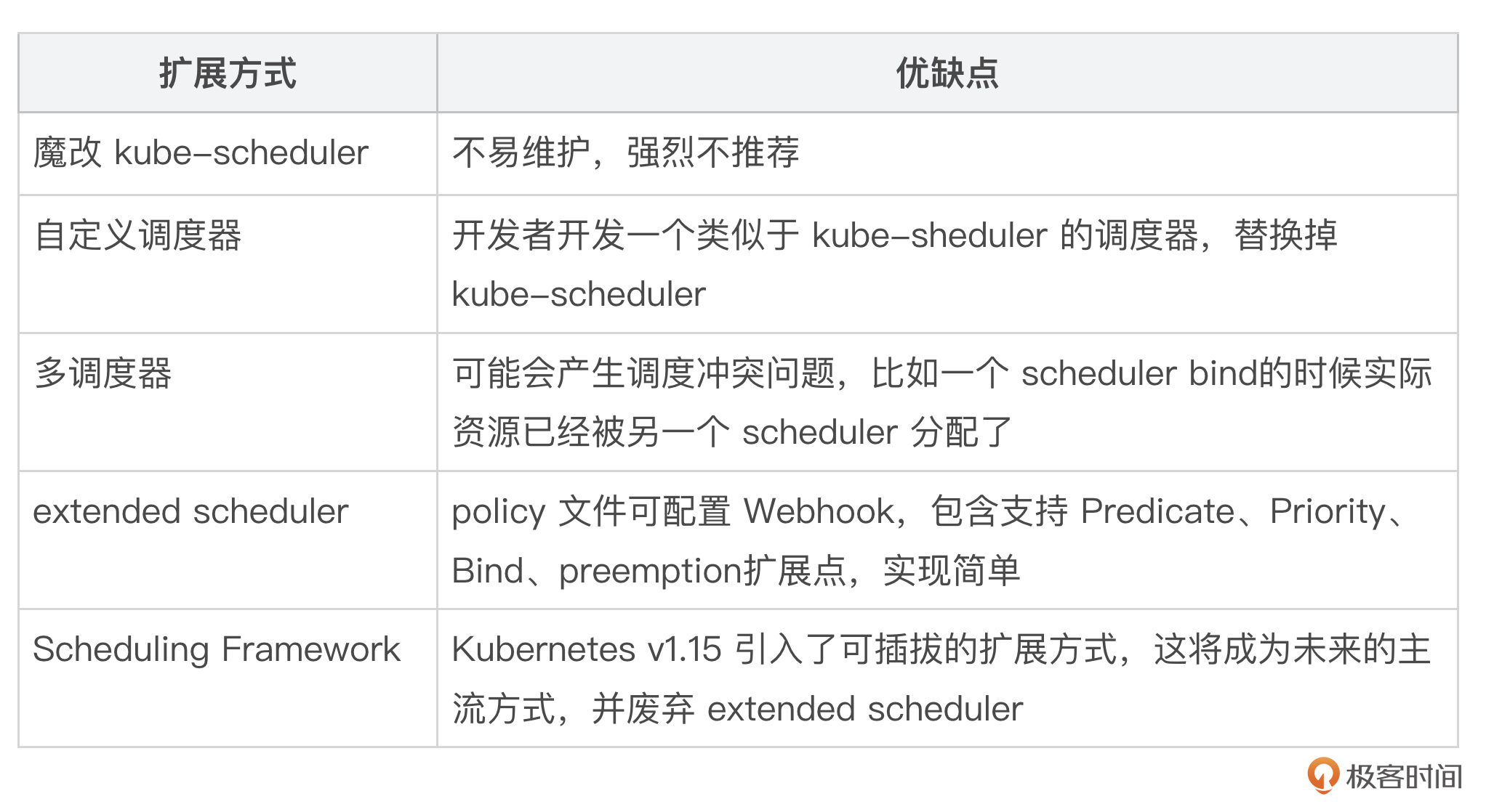 为了满足业务自定义调度策略的刚需,Kubernetes 支持通过多种方式去扩展调度器。支持自定义调度器还有一个很大的好处,就是业务不用担心因为自己开发调度插件或者算法不被 Kuberentes 社区接纳,导致无法平滑使用 Kubernetes 的问题。