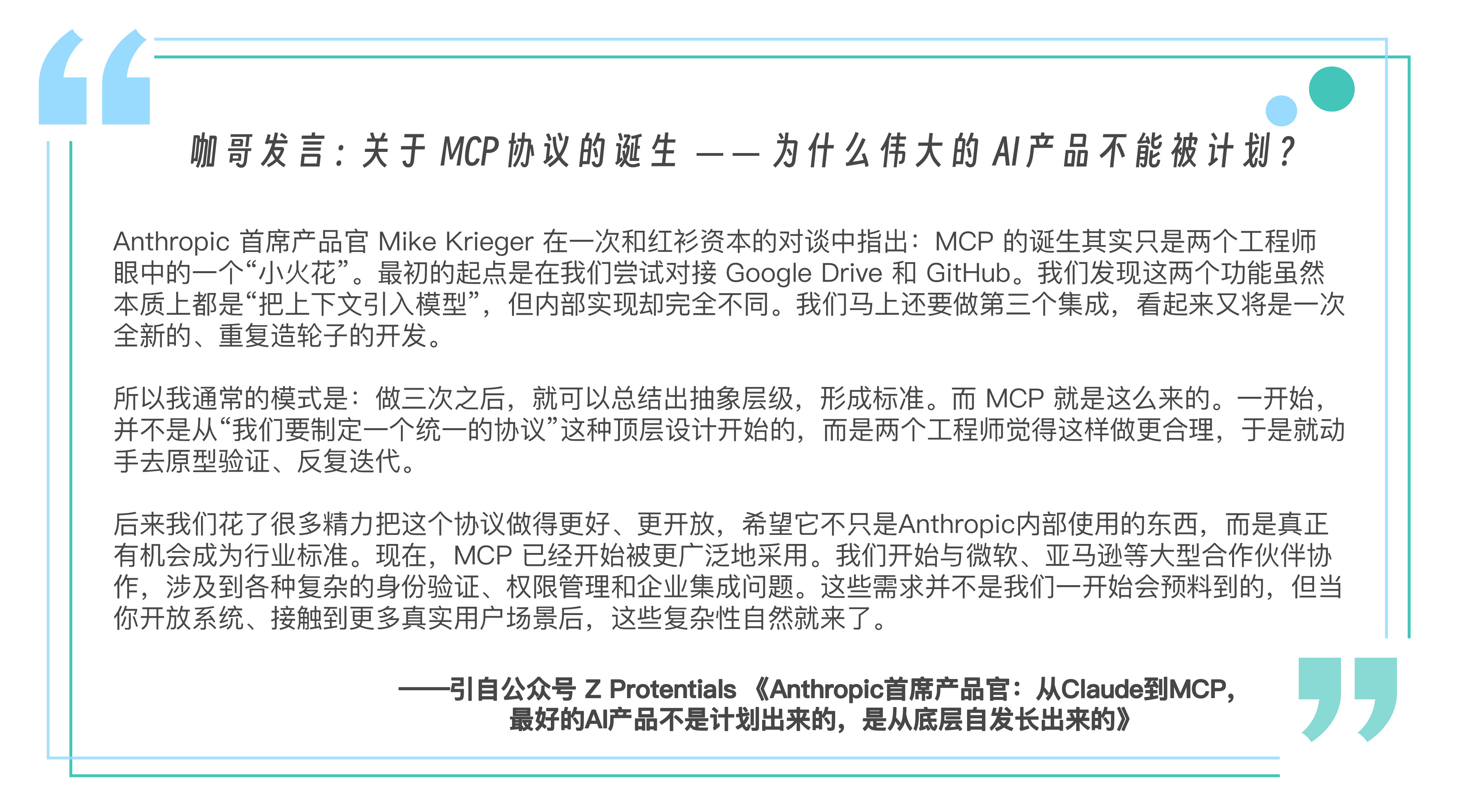 同时,MCP为Agent提供了标准化的工具调用接口和结果回传格式,让大模型可以自主选择、分步调度各类工具执行复杂任务,无需手动注册或编码集成。这将显著提升Agent应用的开发效率和扩展能力。