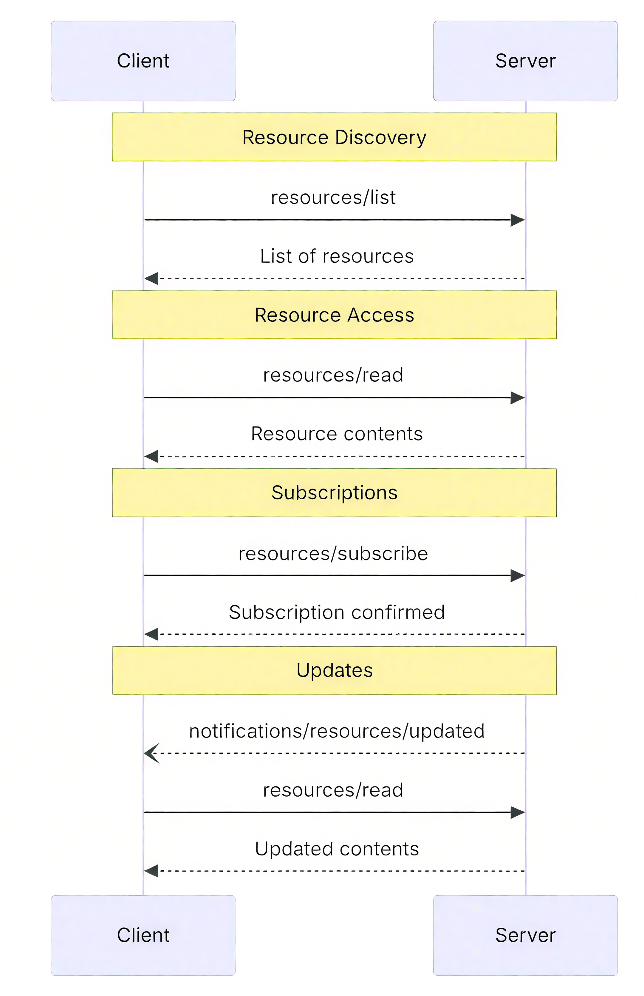 发现:客户端调用 resources/list 拿到资源清单(或模板),再根据清单中的 URI 调用 resources/read 获取实际内容;必要时,还可借助订阅机制保持数据的实时性。