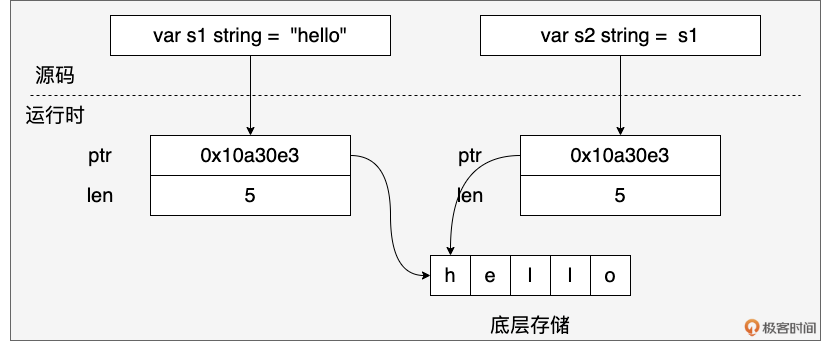 这种设计的关键在于:字符串是不可变的字节序列。当我们创建一个字符串时,Go 会分配一块内存来存储字符串的字节数据,并将 ptr 指向这块内存的起始地址。由于字符串不可变,多个字符串变量可以共享同一个底层字节数组,从而节省内存空间。例如: