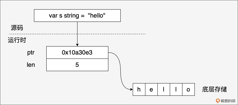 虽然我们在源码层面感觉字符串像字符序列或字节序列,但在 Go 的运行时,一个 string 变量实际上是一个简单的结构体,包含两个字段: