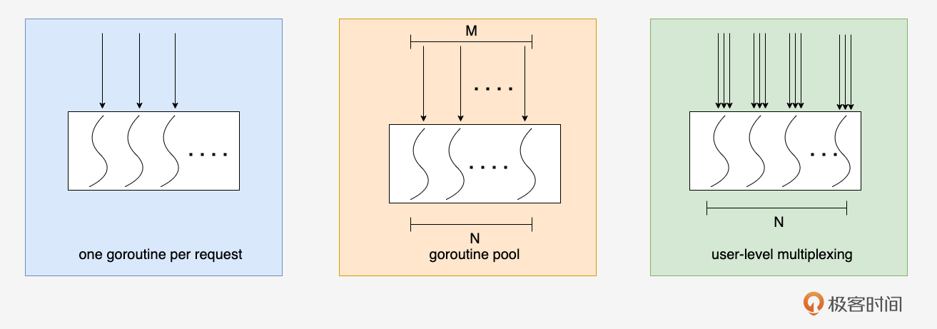 入口并发模型:学习了处理外部请求的三种主要模型:One Goroutine Per Request(